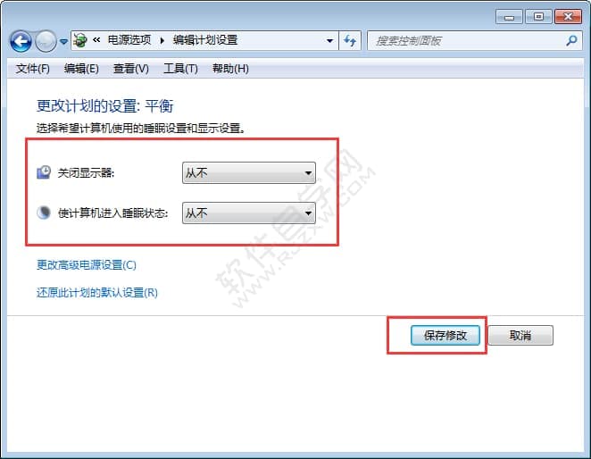 4、关闭显示器设置从不,使计算机进入睡眠状态设置从不。点击保存修改。