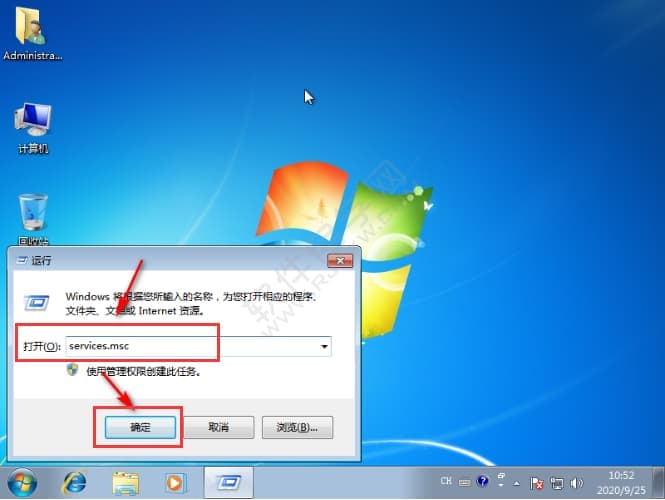 1、同时按下win+r键打开运行窗口,输入“services.msc",点击确定。