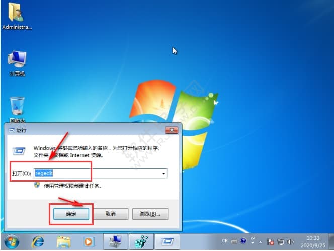 1、同时按下win+r键打开运行窗口,输入“regedit",点击确定。