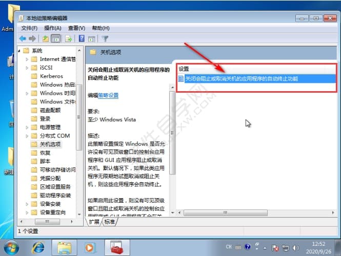 4、然后双击关闭会阻止或是取消关机的应用程序的自动终止功能。