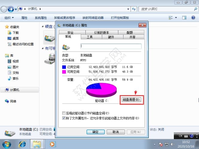 1、首先我们右键c盘,点击属性选项,在弹出的页面点击磁盘清理。