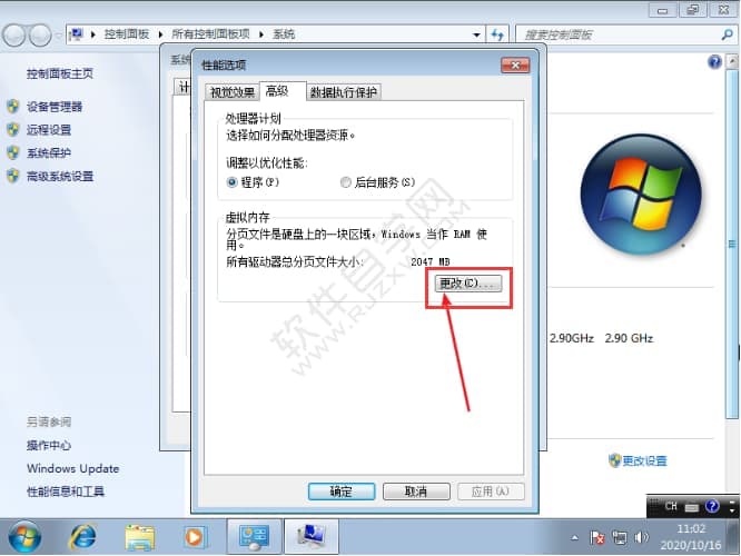 6、点击设置虚拟内存,然后点击更改选项。