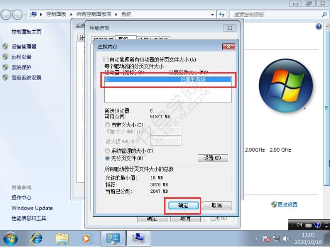 7、接着我们取消勾选第一项,然后选中c盘,选择无分页文件,在设置一个最大值和最小值,再点击确定。