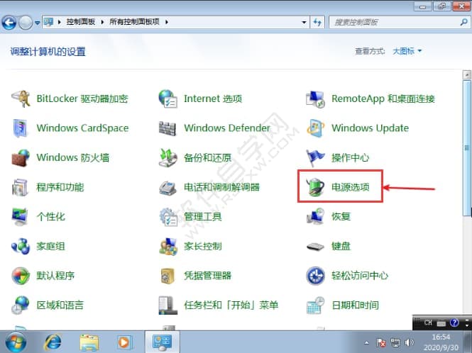 2、接着我们在控制面板页面中找到并点击电源选项。