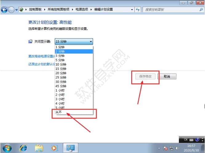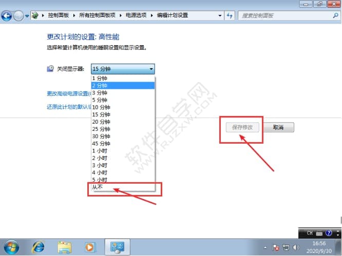 4、接着将关闭显示器这个选项,调至为从不,并点击保存。