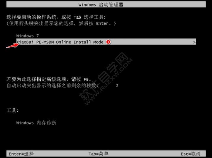 5、在 PE 菜单中选择 第二项XiaoBai PE-MSDN Online Install Mode 菜单进入pe。