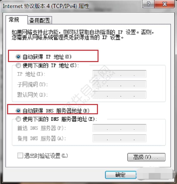 5、然后点击自动获得IP地址。还有自动获得DNS服务器地址。点击确定。