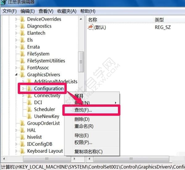 3、然后,依次打开[HKEY_LOCAL_MACHINESYSTEMControlSet001ControlGraphicsDriversConfiguration],最后定位于Configuration,右击,选择“查找”。