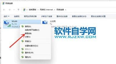 4、进入网络连接界面,右击WLAN,在弹出的菜单点击状态