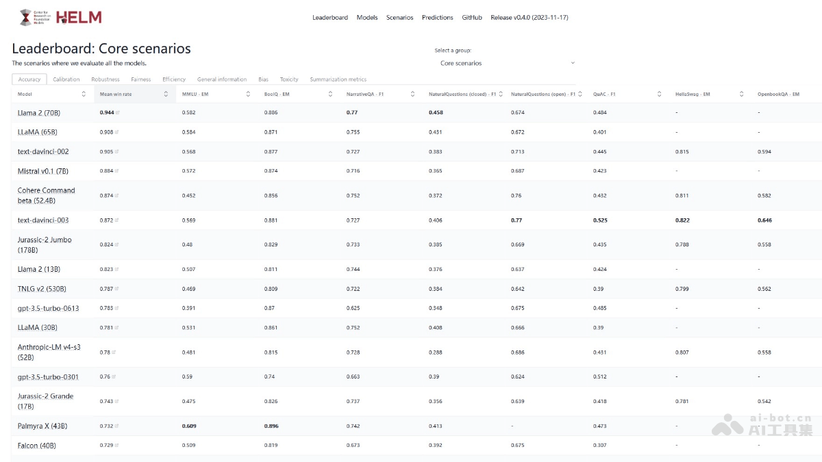 - 全面的评估能力:HELM支持多种语言模型任务(如问答、文本分类、信息检索、文本生成、摘要等),提供多种评估指标(包括准确率、鲁棒性、公平性、偏差、毒性、推断效率等),能够从多个维度全面评估语言模型的性能。