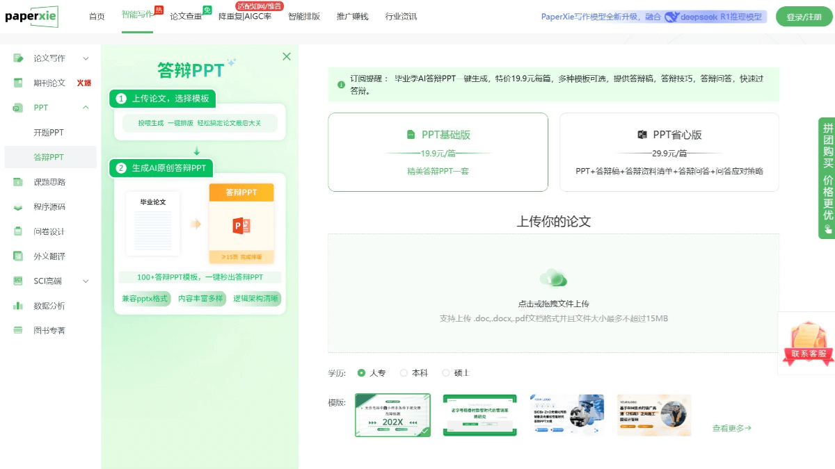 - 论文答辩阶段:自动生成结构化、美观的答辩PPT;提供答辩稿模板和内容建议;模拟答辩场景,提供常见问题及参考答案。