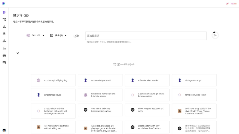 - 批量优化提示词。支持上传 CSV 文件并优化该文件中的所有提示词,接受 .csv 或 .tsv 文件。