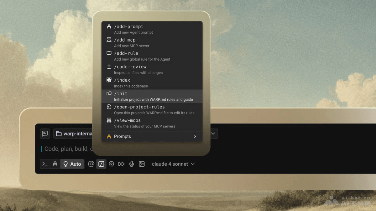 - 使用全局 Slash 命令:Warp 提供全局 Slash 命令,例如 /init、/add-rule、/add-server 等。能帮助用户快速添加全局规则、MCP 服务器和执行保存的 Prompt。