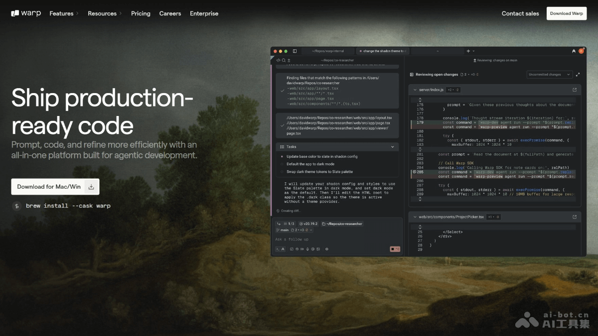 Warp Code 是 Warp 团队最新推出的AI编程工具,构建从 Prompt 到生产环境的完整 AI 辅助编程闭环,具备顶级编码 Agent、代码审查、代码编辑和项目管理等功能,让开发者能在 Warp 内高效完成从编写 Prompt 到代码生成、审查、修改直至发布的全流程,显著提升开发效率和代码质量,是 Warp 从现代化终端向完整 AI IDE 转型的重要一步。