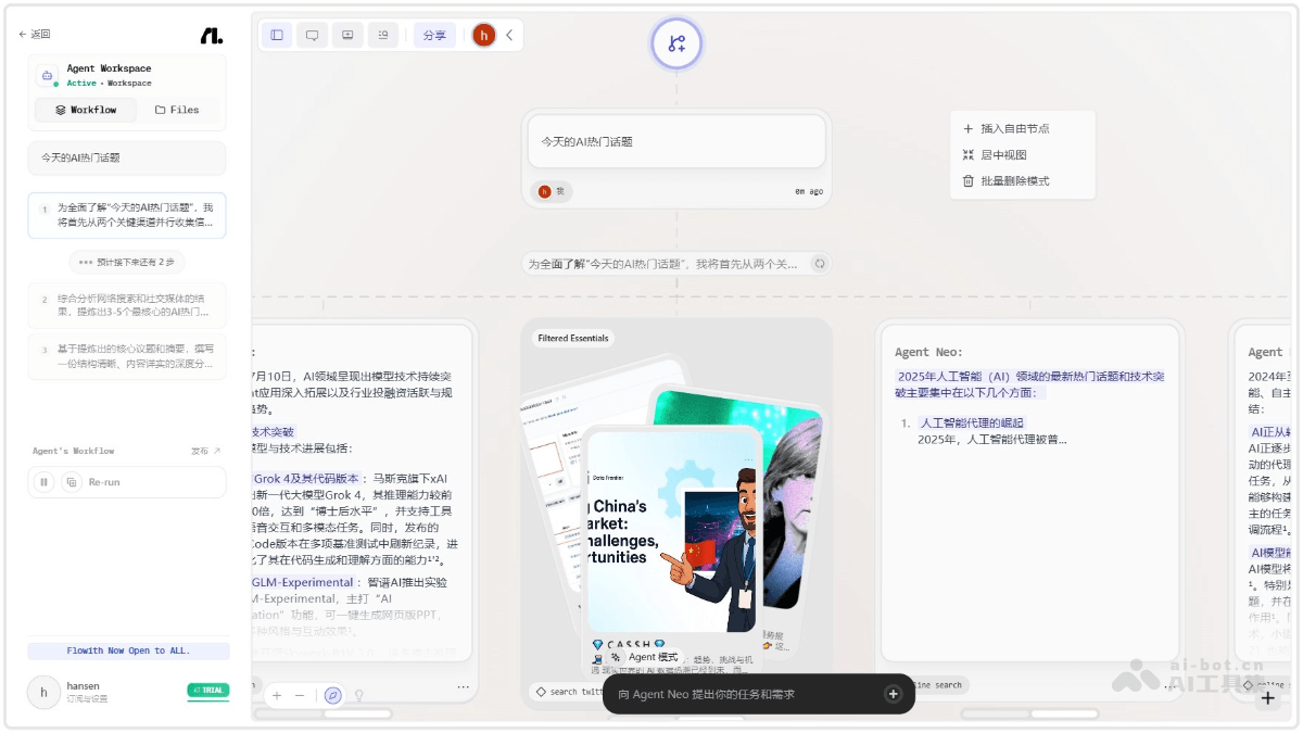 Flowith是创新的画布式AI智能体工具,基于首创的节点式交互方式,让用户用多线程和发散式的思维与AI进行互动。工具由大模型驱动,支持多种先进的AI模型(如Grok4、GPT-4、Claude 3等)及图像生成技术(Midjourney、SDXL),满足不同场景下的需求。Flowith支持文字创作、图片生成、视频制作等多种模式,基于智能体“Neo”实现任务的自动化执行。用户能用知识花园功能管理个人知识库,在“发现更多”中探索社区分享的知识和智能体工作流。Flowith 的 Agent 模式能拆解复杂任务,生成详细的执行计划并逐步完成,适用创意写作、设计、市场调研等多种场景,是创作者和专业人士的得力助手。