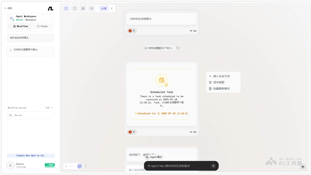 - 智能体Agent模式:基于智能体“Neo”实现任务自动化执行,支持多步骤任务处理并能与用户互动。
