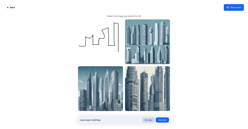 AI工具集编辑随意画了3栋楼的轮廓,然后输入简单的skyscraper buildings提示词,下面生成的3张效果图还是不错的。