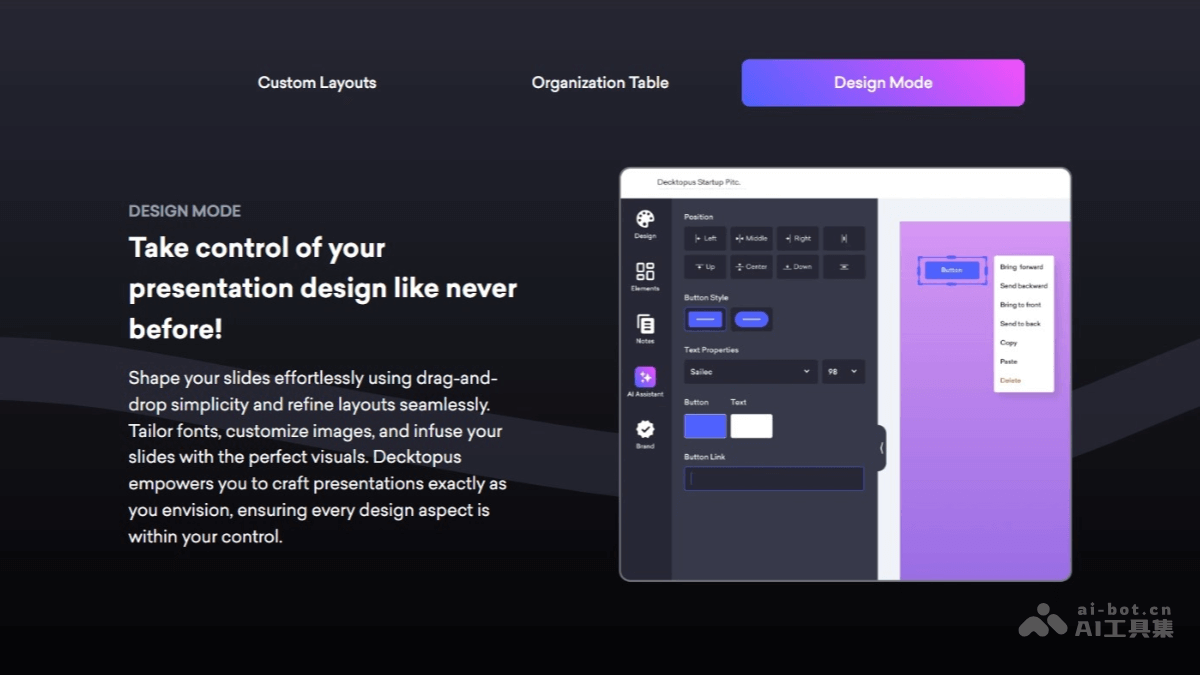 Decktopus AI 是强大的 AI 演示文稿生成工具。用户输入大纲或提示词,工具能快速生成专业演示文稿。Decktopus AI 具备拖放式编辑器、AI 演讲教练、自定义布局、组织面板和设计模式等功能,能大幅提升制作效率,节省时间。Decktopus AI 能将 PDF 转换为互动演示文稿,支持动态问答环节,帮助用户更好地与观众互动。