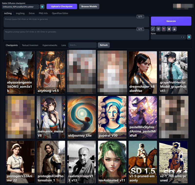 - 内置几十个热门模型,Chilloutmix、Deliberate 等(社区持续贡献中)