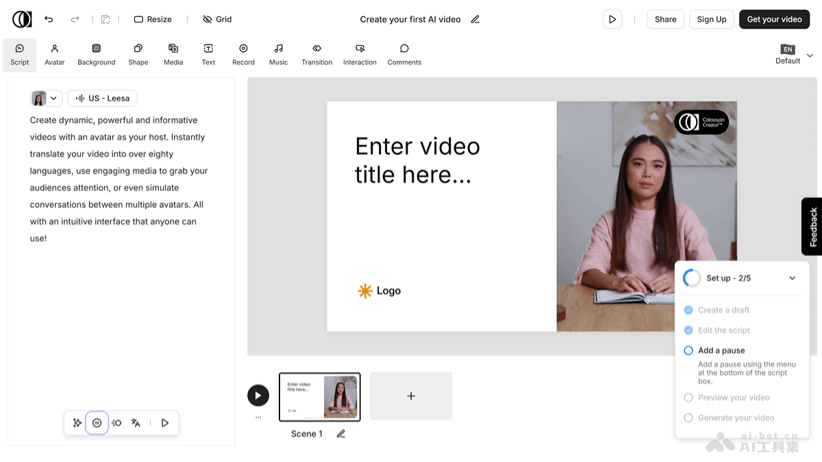 - 编写脚本:在左侧的脚本框中输入文本,添加旁白。为脚本的每个部分分配不同的虚拟形象和声音,模拟对话。
