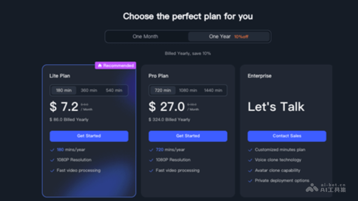 - Lite Plan(推荐):每月7.2美元,每年支付为89美元,提供180分钟/年、360分钟/月、540分钟/月的额度,支持1080P分辨率和无限视频处理。