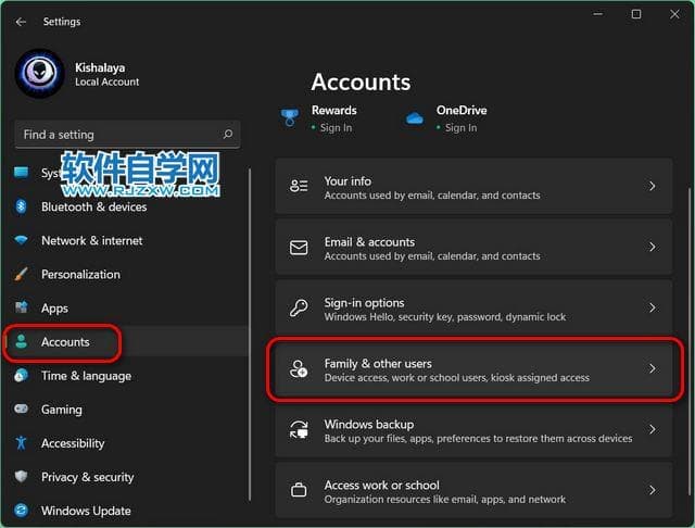 2、使用Windows11键盘快捷键Windows键+I打开您的PC设置。在设置面板上,单击左侧边栏上的“帐户”,然后在右侧窗格中选择“家庭和其他用户”。
