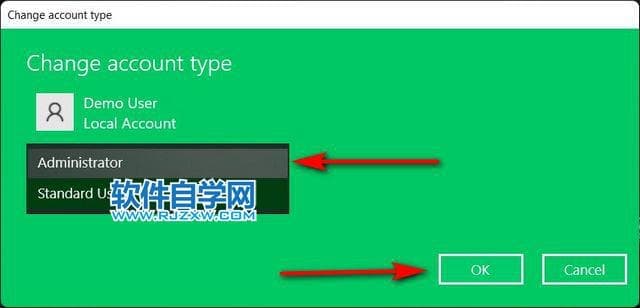 4、您现在将看到一个弹出窗口,您可以在其中更改该用户的帐户类型。在弹出窗口中,单击下拉菜单并选择“管理员”。最后,单击“确定”按钮以实施更改。