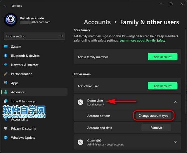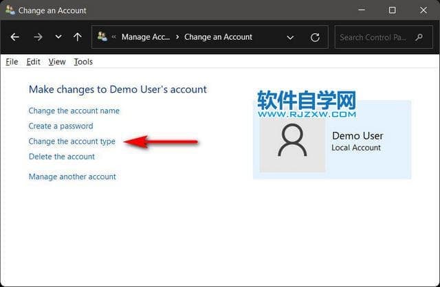 3、在下一页上,单击要从标准更改为管理员的目标帐户。现在,单击“帐户选项”旁边的“更改帐户类型”。