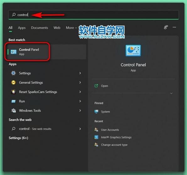 2、在win11专业版PC上打开控制面板。为此,请在Windows搜索栏中搜索“控制”(不带引号),然后从结果中选择“控制面板”。