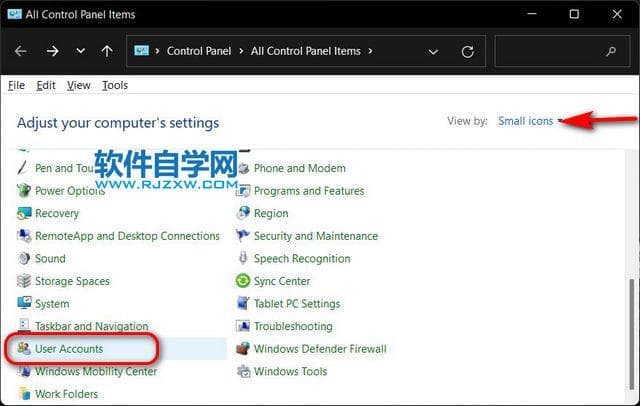 4、在控制面板上,无论您使用的是“图标”视图(小或大)还是“类别”视图,都单击“用户帐户”。