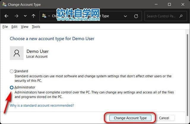 9、在下一页上,将帐户类型从标准更改为管理员。最后,单击底部的“更改帐户类型”按钮。