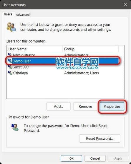 4、注意:您也可以双击目标用户帐户打开“属性”窗口。