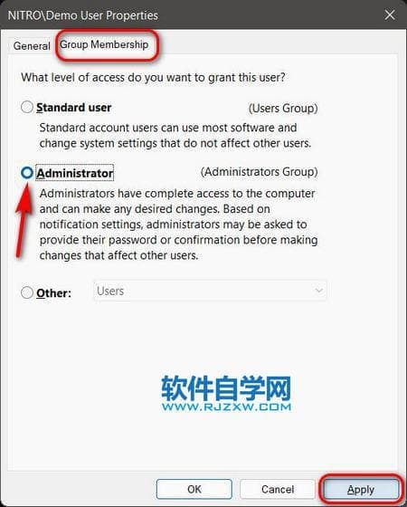 5、在“属性”窗口中,导航到“组成员身份”选项卡。在这里,选择“管理员”并单击底部的“应用”以保存更改。