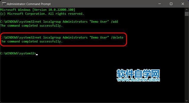 4、要从帐户中删除管理员权限,请执行以下命令:netlocalgroupAdministrators“DemoUser”/delete.同样,将DemoUser替换为目标用户的实际帐户名。