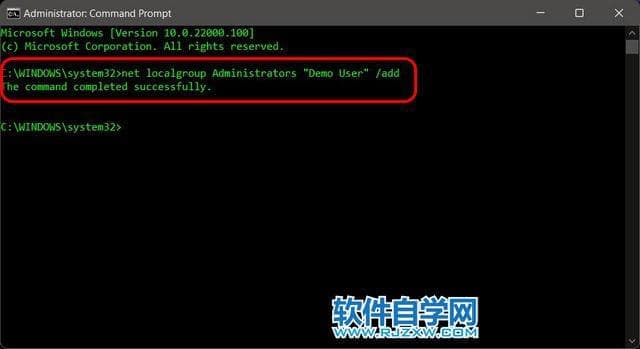 3、现在将以下命令复制并粘贴到命令提示符窗口中:netlocalgroupAdministrators“DemoUser”/add然后按Enter。将“演示用户”替换为您要授予管理员权限的实际帐户名。您将收到一条消息,提示“命令成功完成”。