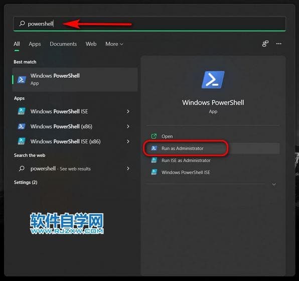 2、在管理员模式下打开WindowsPowerShell。为此,请在Windows搜索栏中搜索“powershell”并选择“以管理员身份运行”。