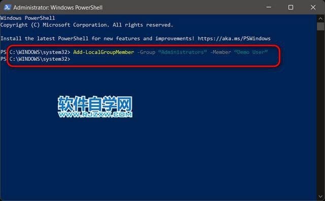 3、现在,复制粘贴+以下命令,然后按Enter键:Add-LocalGroupMember-Group“Administrators”-Member“DemoUser”。
