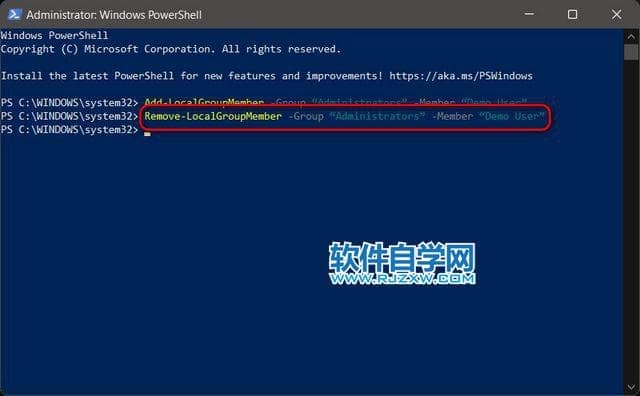 5、您可以使用以下命令恢复更改:Remove-LocalGroupMember-Group“Administrators”-Member“DemoUser”