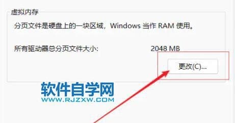 第5步、接着在其中找到虚拟内存,点击下方的“更改”就可以设置虚拟内存了。
