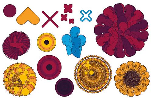 | 2、我将创建一些构成图像的物体,我想将符号反复重复构成圆形,例如像用婴儿构成的花形。每个物体都将采用3种渐变的颜色:紫色,黄色,蓝色。我会根据它们在图中的位置来给它们定义颜色。 |