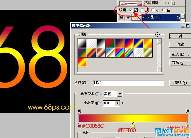 | 2.把文字图层删格化图层,然后锁定如图2箭头头的地方勾选,使用渐变工具颜色设置如下图,绘制由上到下的线性渐变。 |
