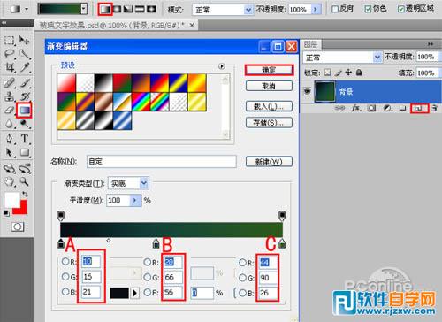 | 2、选择工具箱渐变工具(快捷键G),在工具选项栏中设置为线性渐变,然后点按可编辑渐变,弹出渐变编辑器。设置黑色到白色,双击如图2中的A处,设置色彩RGB分别为10、16、21,再双击如图2中的B处,设置色彩RGB分别为20、66、56,再双击如图2中的C处,设置色彩RGB分别为44、90、26,单击确定按钮,接着按键盘 Shift 不放结合鼠标从上到下拉下,给渐变效果,按键盘快捷键 Ctrl+D 取消选区,如图2所示。效果图如图3所示。 |