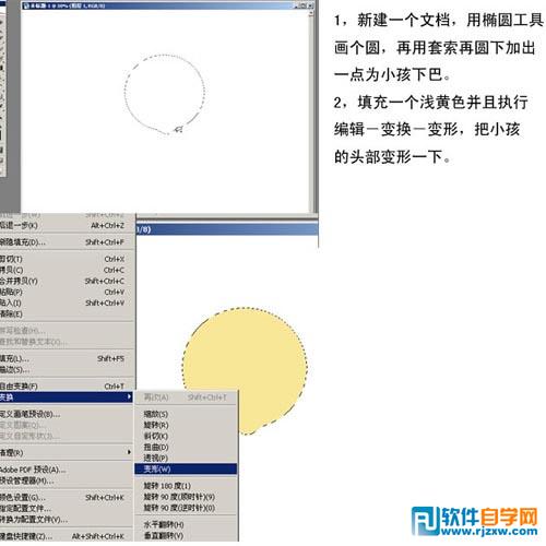 | 1. 新建一个文档,用椭圆工具画个圆,再用套索在圆下加出一点为小孩下巴。 2. 填充一个浅黄色并且执行编辑—变换—变形,把小孩的头部变形一下。 |