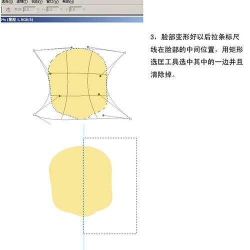 | 3. 脸部变形好以后拉条标尺线在脸部的中间位置,用矩形选框工具选中其中的一边并且清除掉。 |
