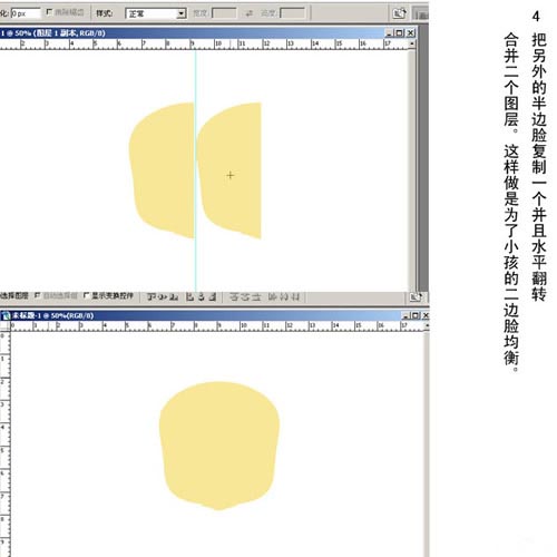| 4. 把另外的半边脸复制一个并且水平翻转合并二个图层。这样做是为了让小孩的两边脸均衡。 |