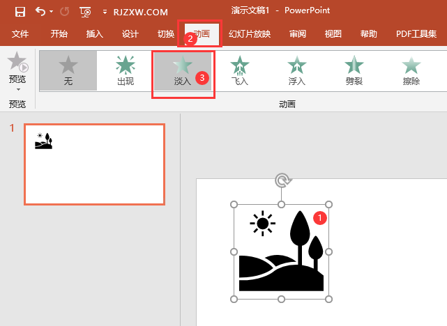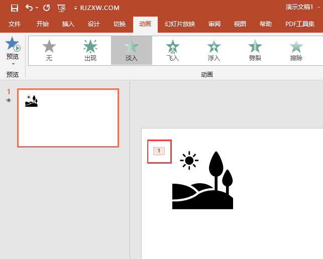 PPT怎么给对象加淡入视野效果 日期:2025-12-25 21:31:07 栏目:软件教程 浏览:2 评论:0 1、打开PPT2019软件,插入一个图标进来,选中对象。 2、点击动画菜单,点击淡入动画。 3、设置好后,图标的左上角有标记。也可以点击预览效果。 上一篇:chatgpt付费账号 下一篇:如何训练chatgpt做产品开发 相关推荐 PS简单制作金色发光字效果 solidworks使用拉伸凸台、筋、拉伸切除绘零件图 如何训练chatgpt做产品开发 PPT怎么给对象加淡入视野效果 评论留言 我要留言 ◎欢迎参与讨论,请在这里发表您的看法、交流您的观点。 昵称:* 邮箱:* 网址: 内容: 取消回复