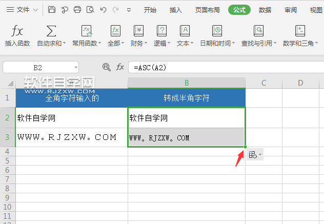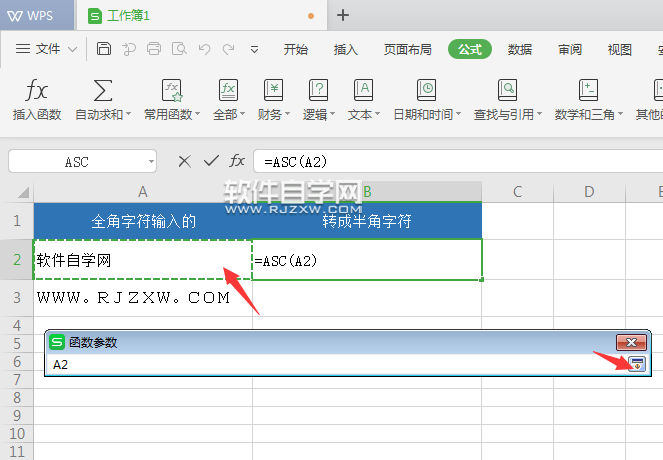 第1步、点击公式菜单,点击文本里面的ASC函数。
