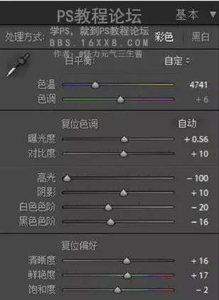根据分析,在基本调试里适当加一些曝光,再减淡高光,提高清晰度让照片加点质感,其他数值也根据个人喜好微调。