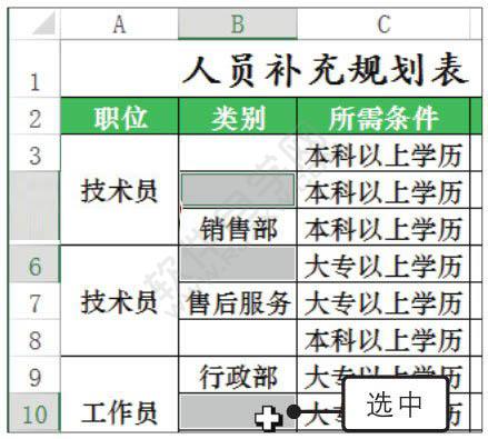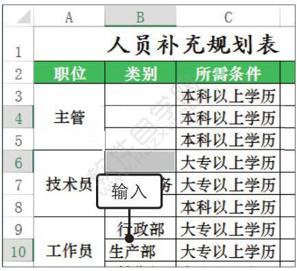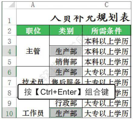 3、快速填充文本。输入完毕后按【Ctrl+Enter】组合键,便可在单元格B4、B6中自动填充“生产部”文本,如图所示。