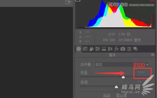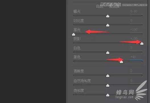 三、在ACR中打开RAW原图,调整“高光”滑块压缩高光区域,调整“阴影”滑块和“黑色”滑块再次提升暗部细节,将像素压缩集中到中区。